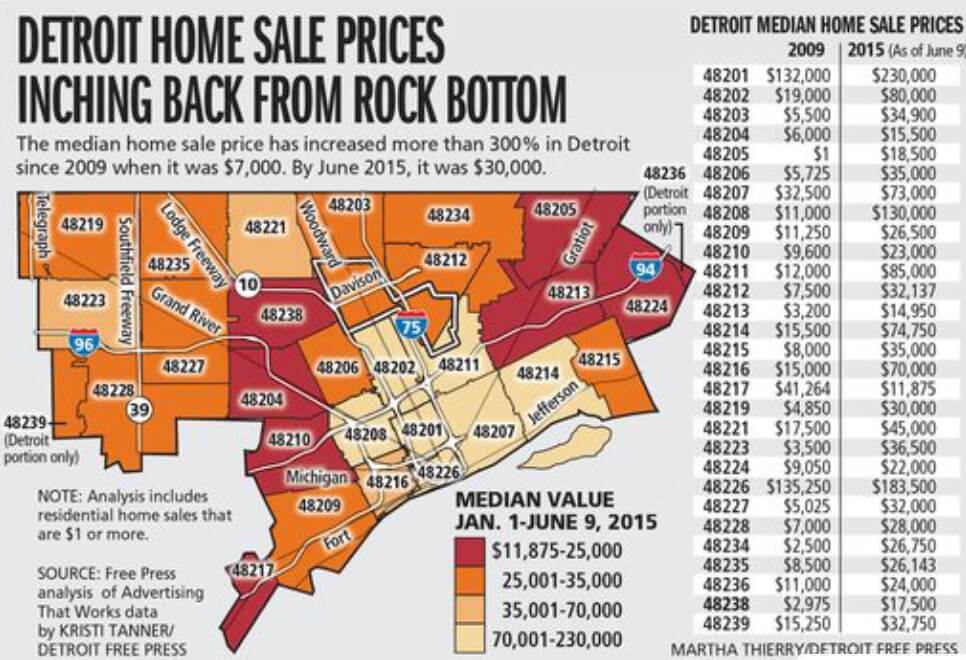 When the government agreed to help clear blight in the neighborhoods of residential Detroit, some areas were given Detroit Home Sale Priceshigher priority than others.  Neighborhoods with swaths of burned down and condemned homes, abandoned by their previous residents had become havens for crime and drug activity. On the other hand, some neighborhoods still held promise for safe, family living. While local investors took interest in the relatively safer, popular neighborhoods, many news outlets and media reports focused on the unbelievable $1 deals in Detroit, resulting in foreign/out of state investors pumping money into the less popular, higher risk neighborhoods.  The accompanying chart, taken from the Detroit Free Press, displays home prices across the city, just to give an idea of it’s diversity.